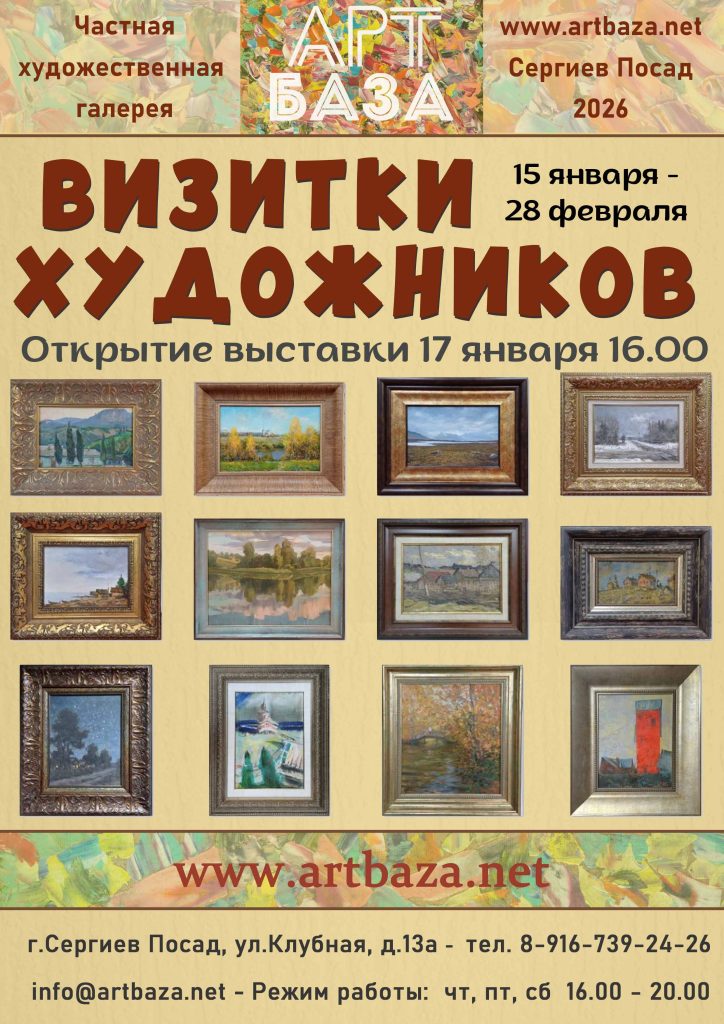 Дорогие друзья! Приглашаем Вас на очередную необычную выставку в нашей галерее — «ВИЗИТКИ ХУДОЖНИКОВ». Будут представлены работы 120 художников — участников выставок в АртБазе. Большинство работ написаны специально к этой выставке и отражают уникальность и узнаваемость каждого автора.